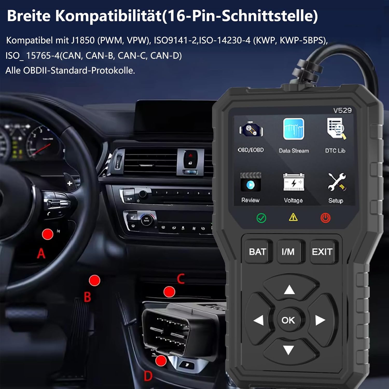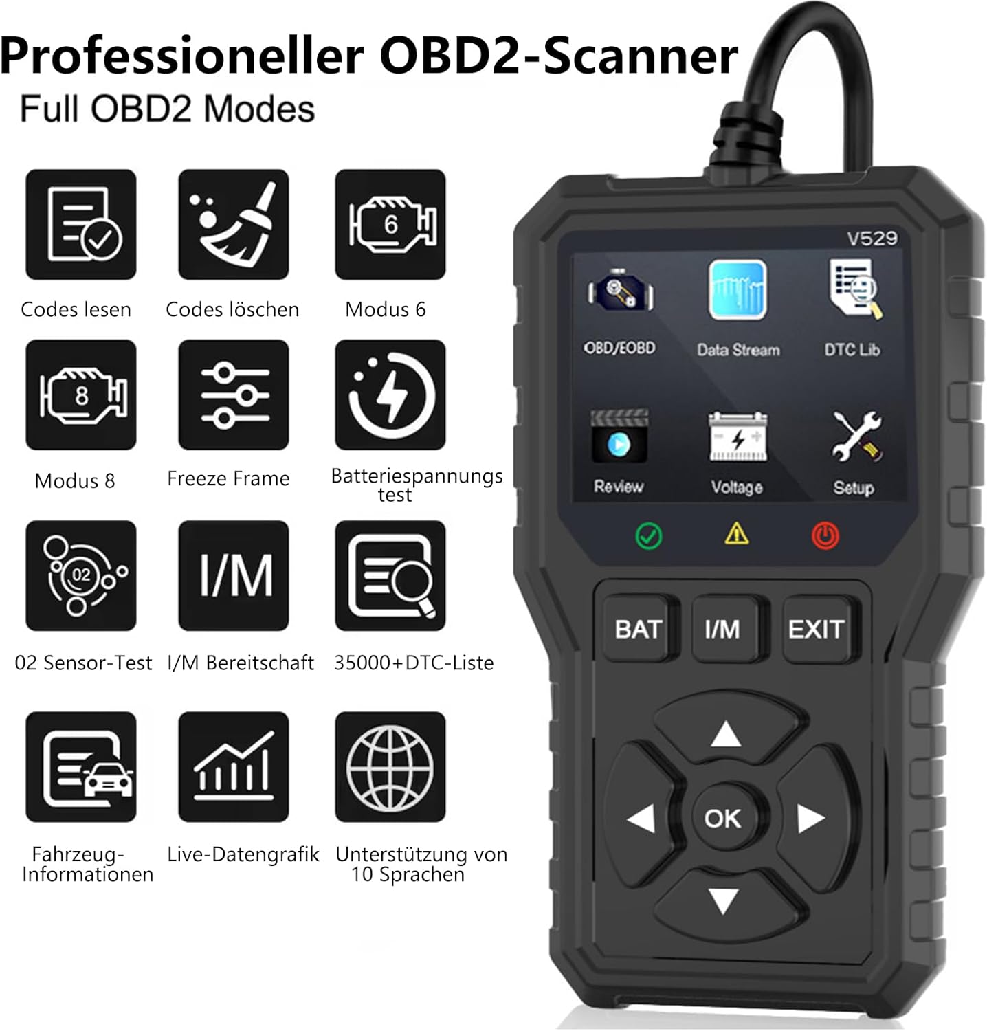 A V529 10 nyelvet támogat, és számos gyártóval működik, beleértve a Volkswagent, BMW-t, Audit, Mercedest, Fordot, Toyotát és sok mást, szabványos OBD2 protokollokat használva.